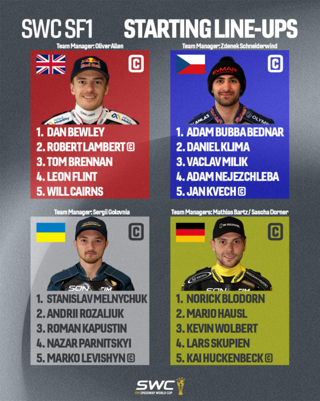 L’Allemagne, pays hôte, affrontera la Grande-Bretagne, double championne du monde du FIM Speedway of Nations, la République tchèque et l’Ukraine, qui fait ses débuts en SWC. L’équipe victorieuse se qualifiera pour la finale de la Coupe du Monde de Speedway FIM BOLL – Varsovie au PGE Narodowy, le 29 août.